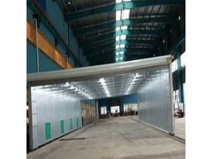 整體移動式噴漆間的設(shè)計目的,是為了滿足較大型工件 打磨或噴漆的需要。一般情況下每套房體對應(yīng)2~3個排風(fēng)凈化工位,哪個工位上的工件需要噴漆時,房體則行走移動到那個工位,其他工位可以繼續(xù)打磨工作,待 房體內(nèi)的工件噴漆完畢后,再控制移動房體行走到打磨完畢后的工件工位,如此設(shè)計可以實現(xiàn)大型工件的不間斷連續(xù)噴漆工作。房體為鋼結(jié)構(gòu)構(gòu)造,房體立柱下面設(shè)置有兩臺電動驅(qū)動行走機構(gòu),行走機構(gòu)沿地面軌道行走。移動房體兩端設(shè)置有電動卷簾大門,房體行走時,大門升起,待到達指定位置時,大門降落關(guān)閉。大門與行走機構(gòu)由電氣控制部分連鎖控制,大門完全升起后,房體才可移動行走。
